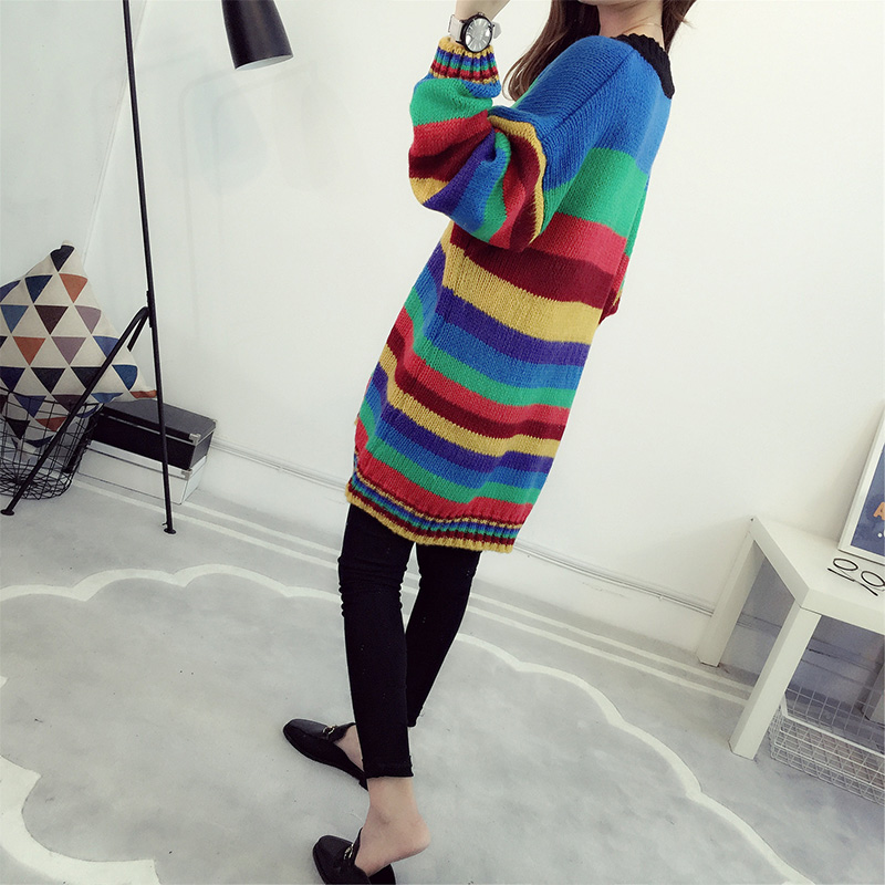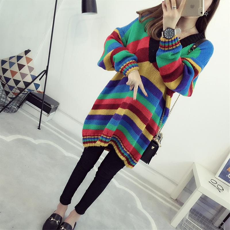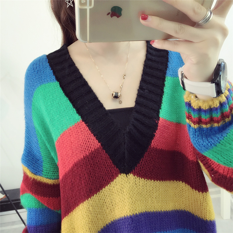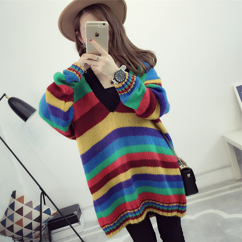 / 套頭毛衣女秋冬韓版寬松中長款V領條紋針織衫外套女裝新款潮