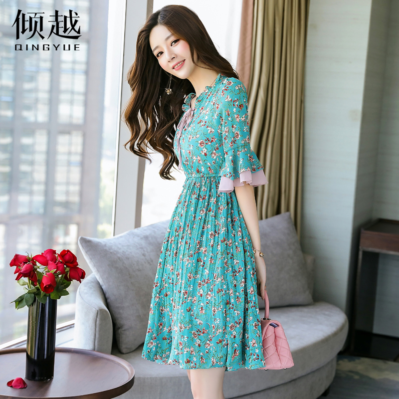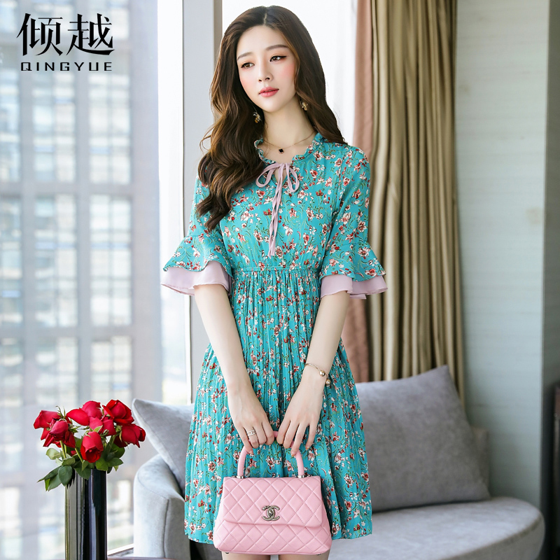 / 2017甜美小清新淑女雪紡連衣裙韓版碎花松緊腰荷葉袖修身百褶裙夏