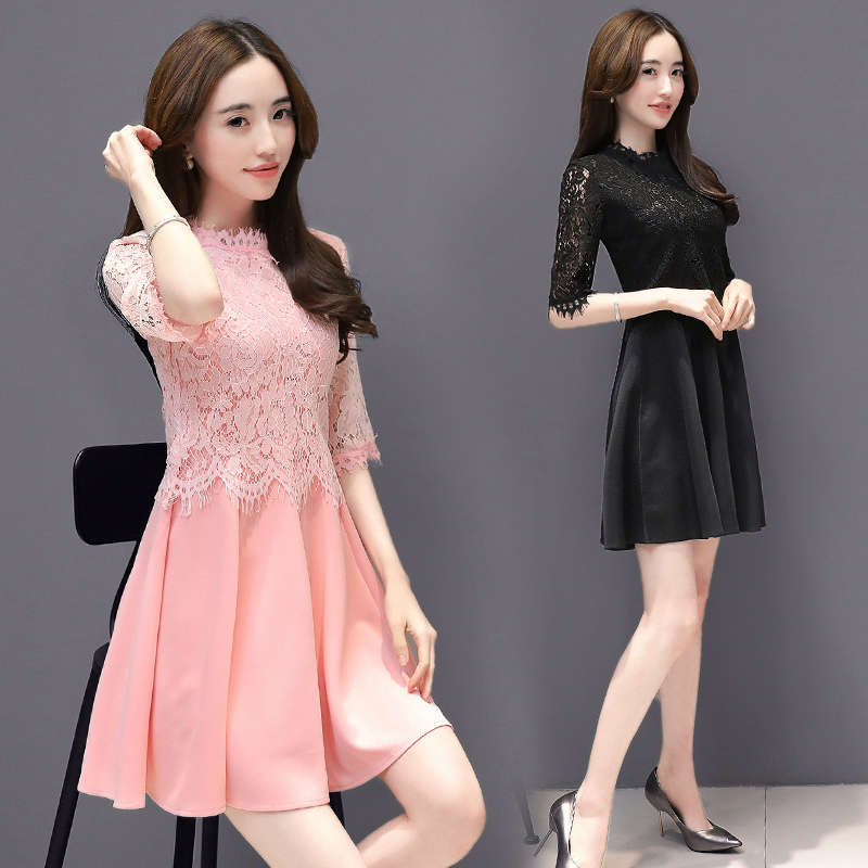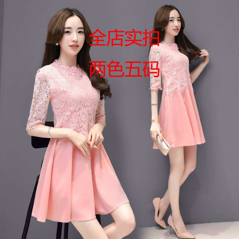 / 夏裝新款蕾絲連衣裙中裙長袖韓版時尚五分袖修身顯瘦假兩件女
