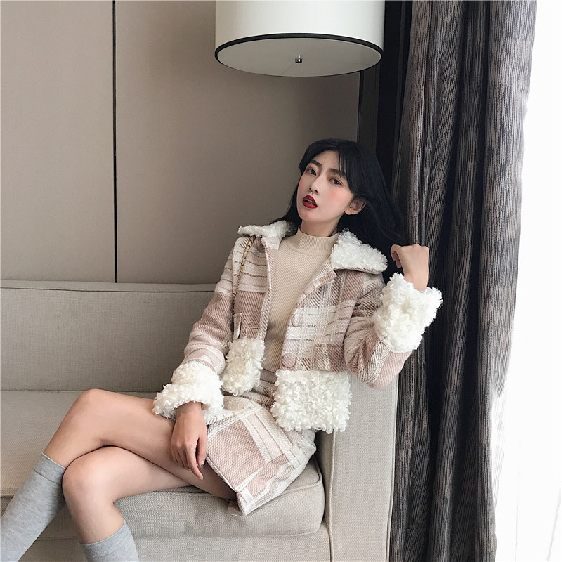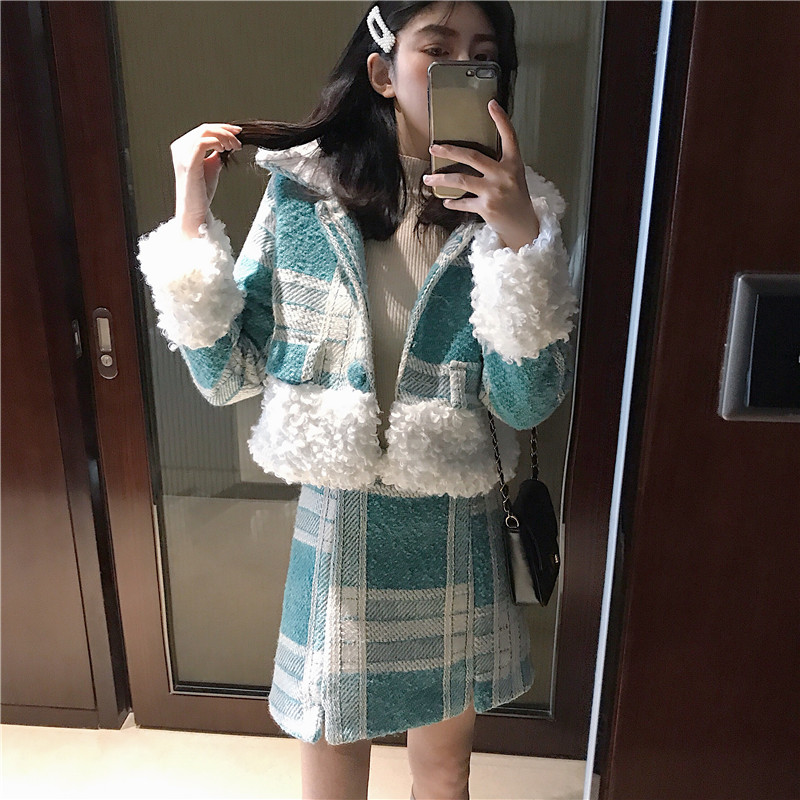 冬時尚氣質羊毛呢子短款格子毛領毛呢外套女+毛呢半身裙