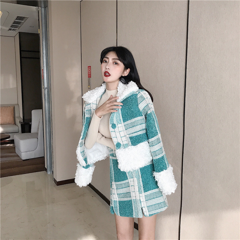 / 冬時尚氣質羊毛呢子短款格子毛領毛呢外套女+毛呢半身裙