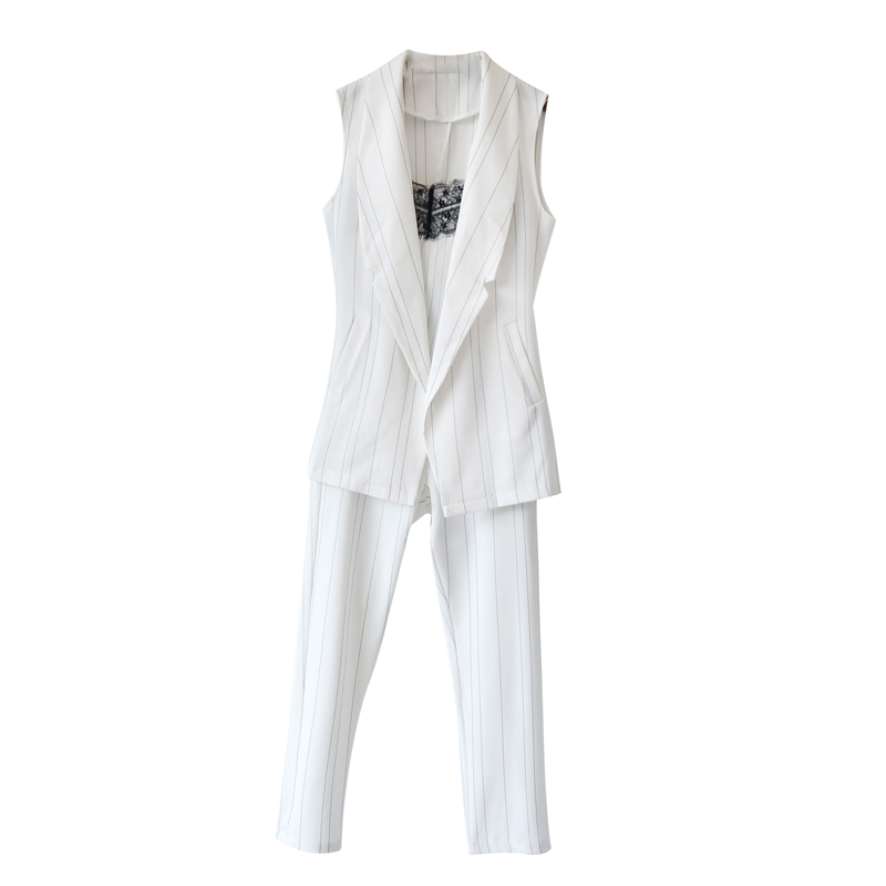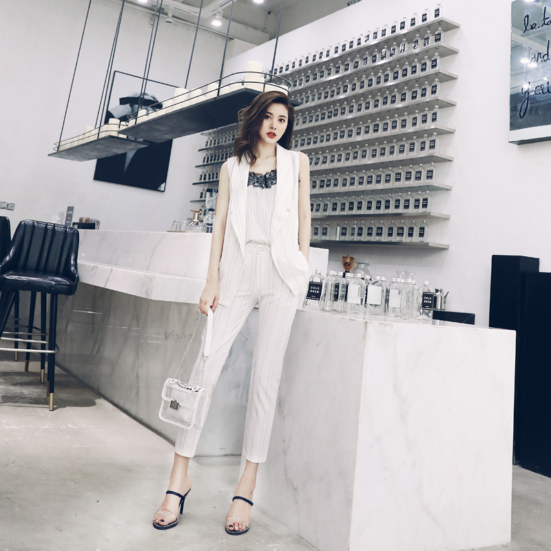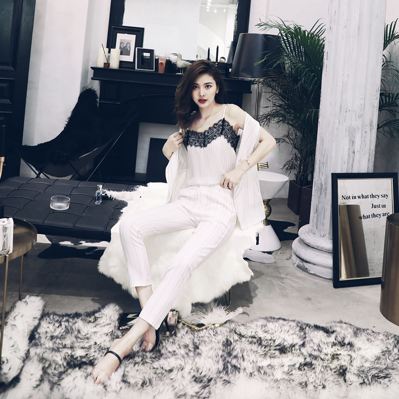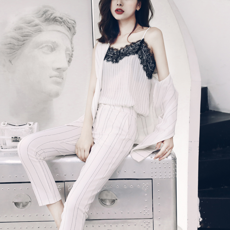 / 氣質洋氣名媛套裝女夏2018新款吊帶上衣條紋九分褲馬甲時尚三件套
