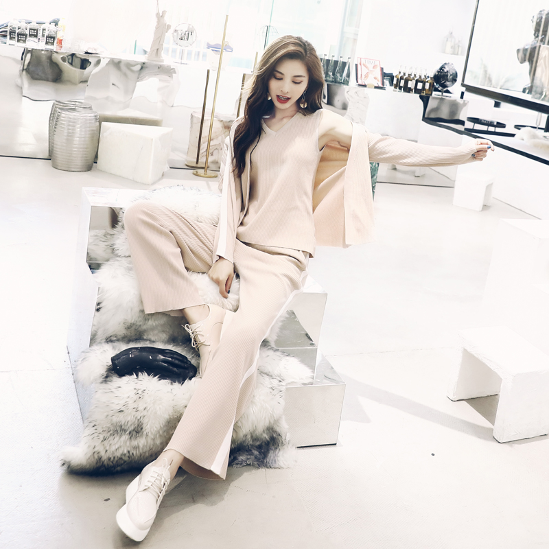 名媛氣質2018春秋裝新款韓版背心針織開衫闊腿褲時尚氣質三件套裝
