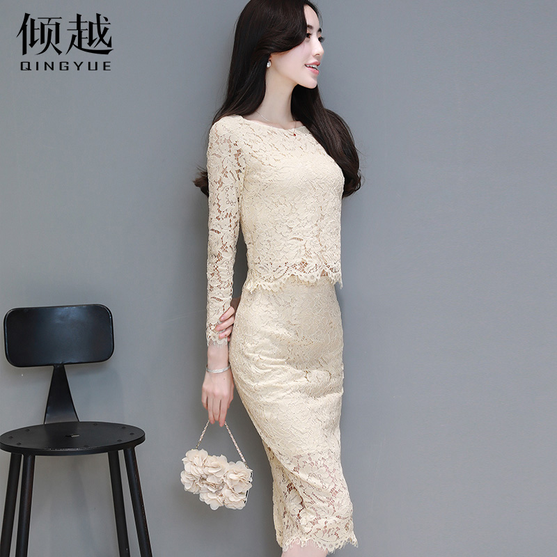/ 傾越2017年春季韓版兩件套裝裙長袖純色圓領蕾絲包臀打底連衣裙女