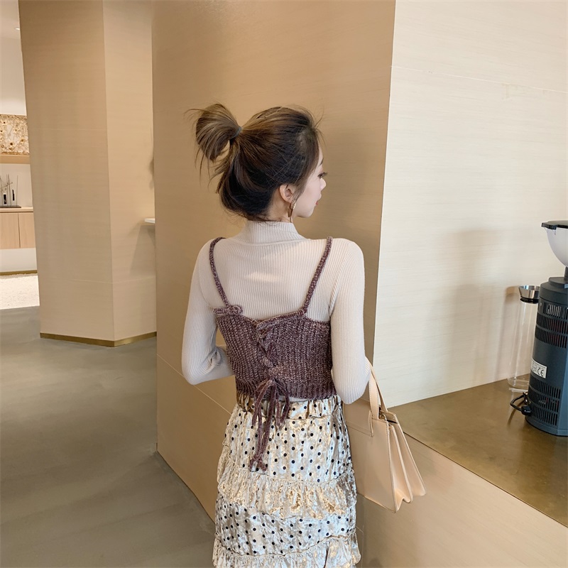 韓版高腰荷葉邊A字裙后背綁帶針織吊帶針織打底衫三件套時尚套裝