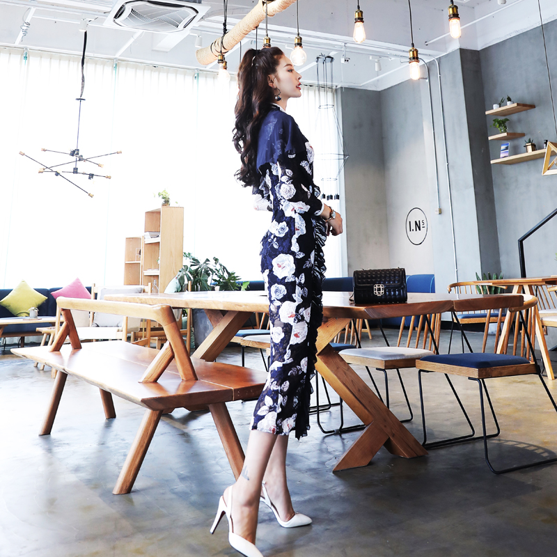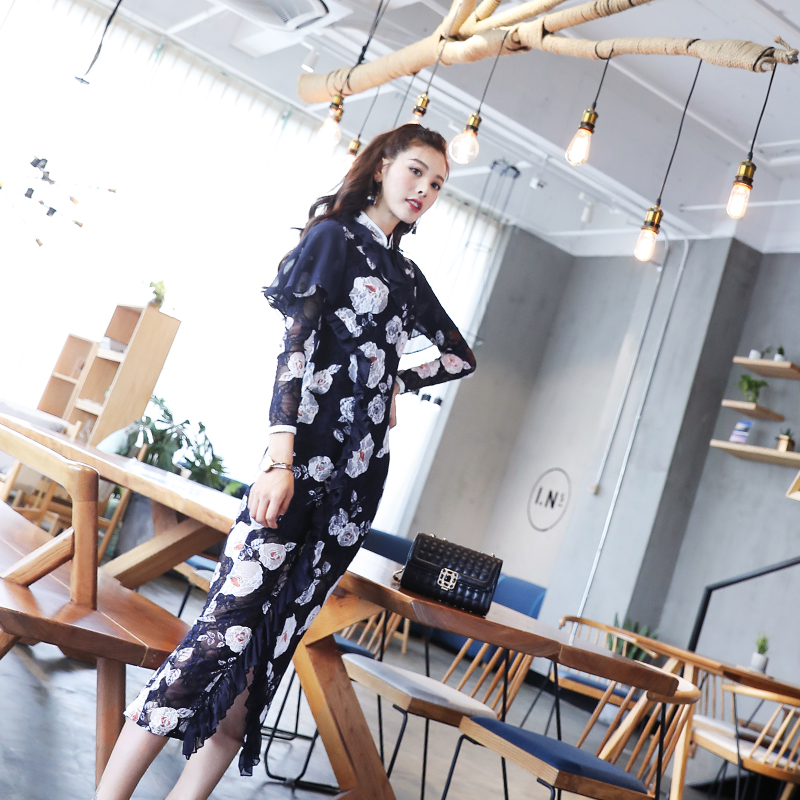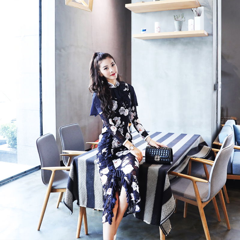 / 名媛氣質2018春季新品淑女顯瘦改良旗袍中長款深藍蕾絲連衣裙個性