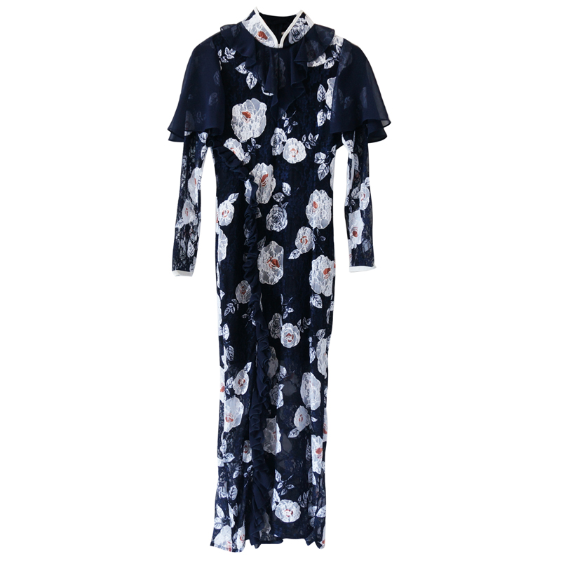 名媛氣質2018春季新品淑女顯瘦改良旗袍中長款深藍蕾絲連衣裙個性