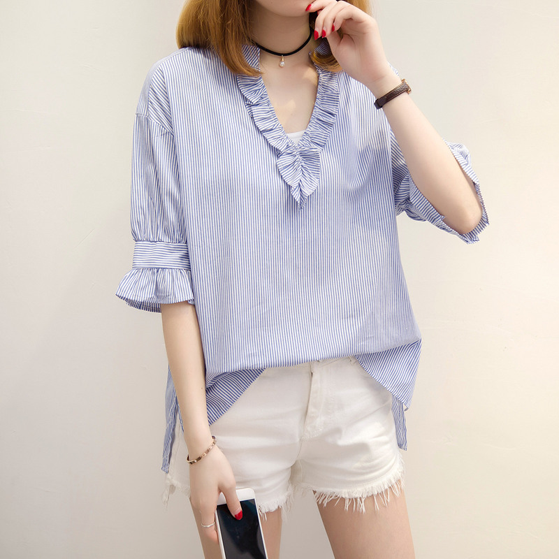 夏裝新款女裝寬松半袖條紋襯衫女甜美上衣小清新韓范bf風襯衣