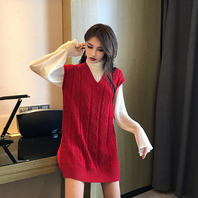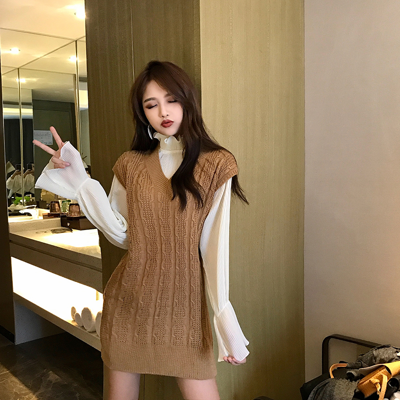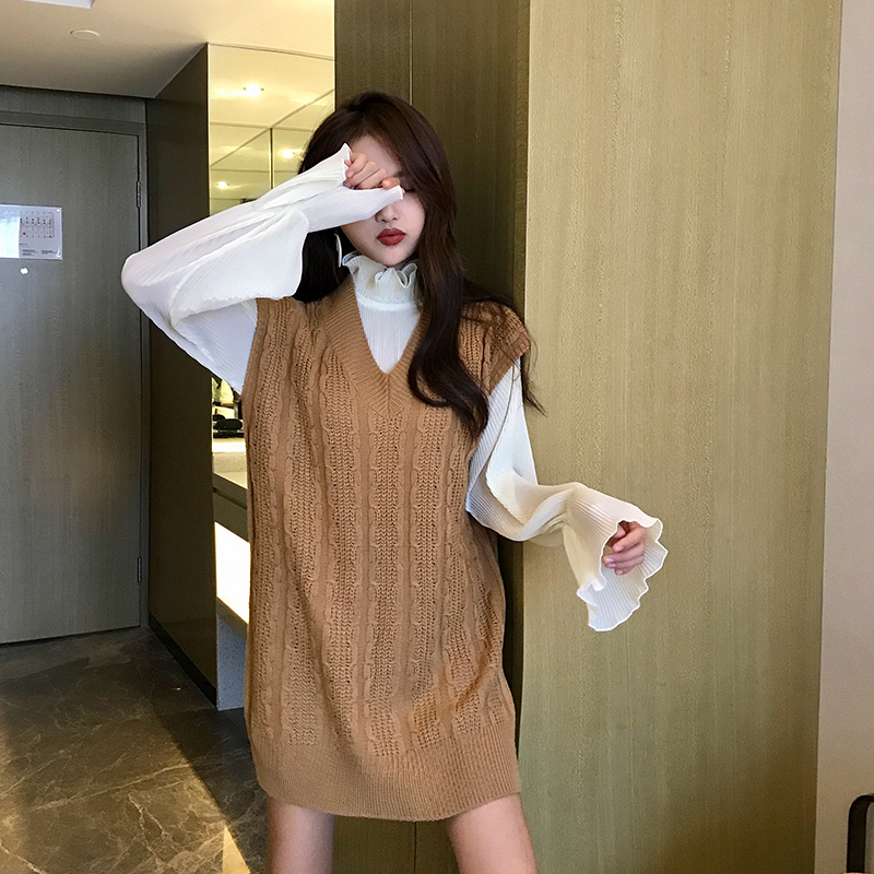 / 時尚套裝新款寬松中長款馬甲chic兩件套女喇叭袖打底針織衫上衣潮