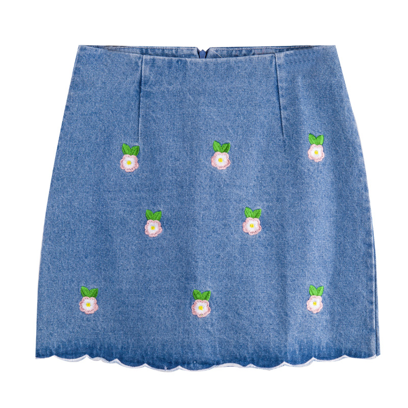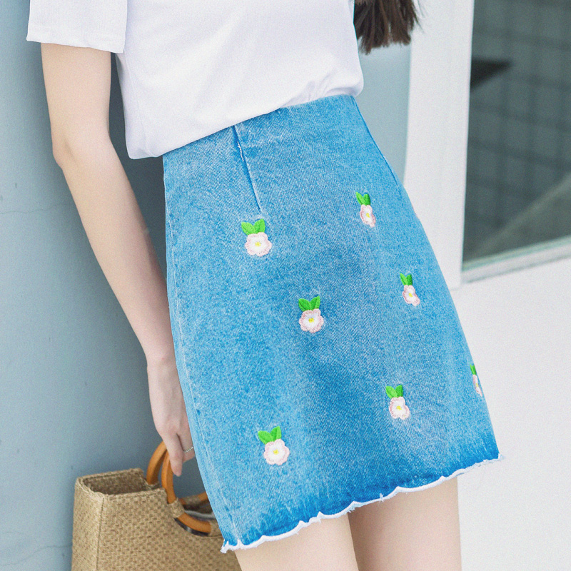 / 牛仔半身裙女夏裝新款女裝韓版百搭刺繡高腰修身白色毛邊短裙