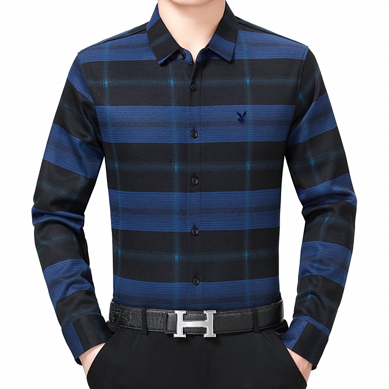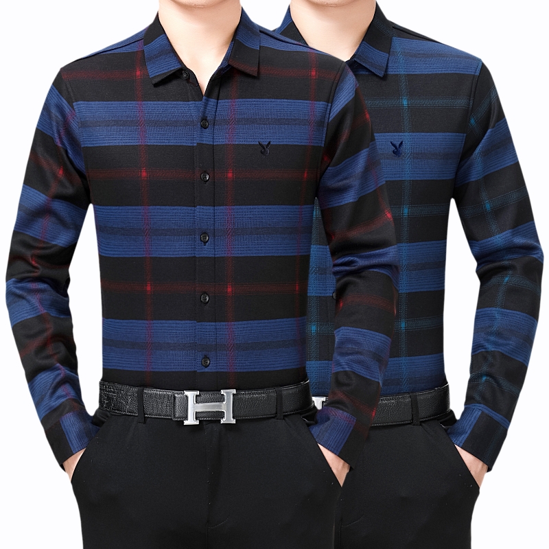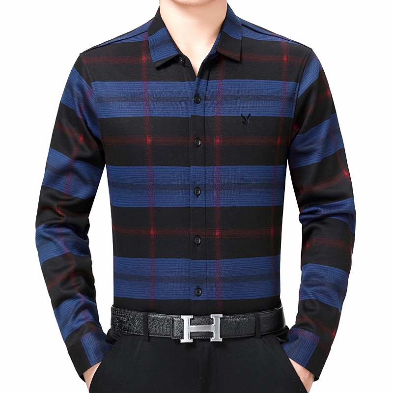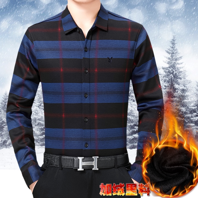 花花公子正品中年男士長袖羊絨襯衫商務男裝加絨加厚格子襯衣冬季