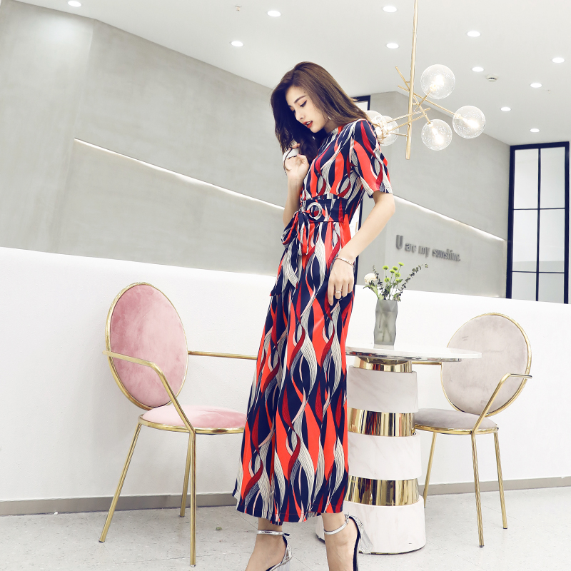 / 名媛氣質2018夏季新款印花短袖九分闊腿收腰顯瘦網紅溫柔連體褲女