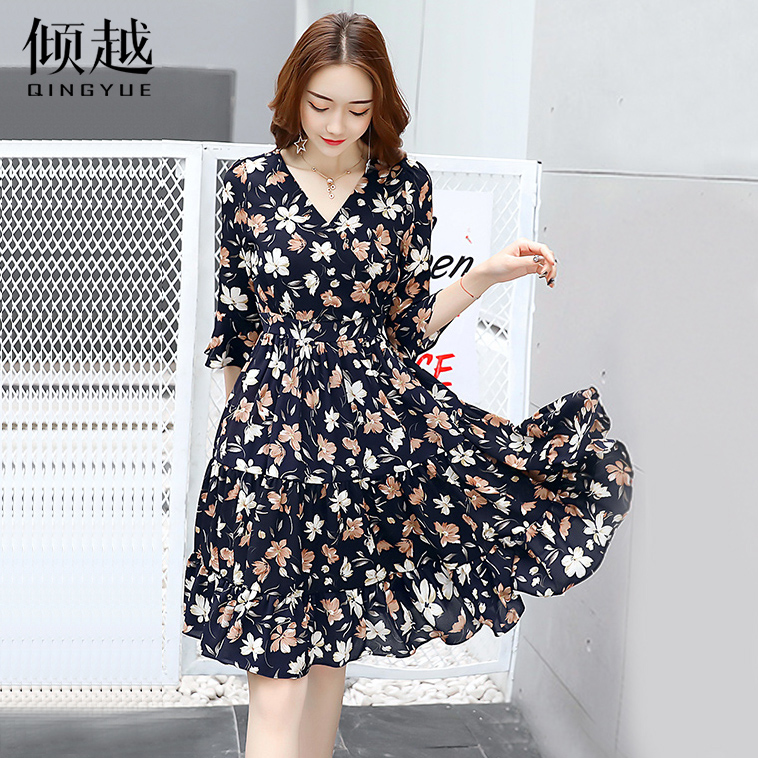 / 傾越2017夏季新款V領短袖碎花連衣裙中長款修身顯瘦雪紡裙子女潮