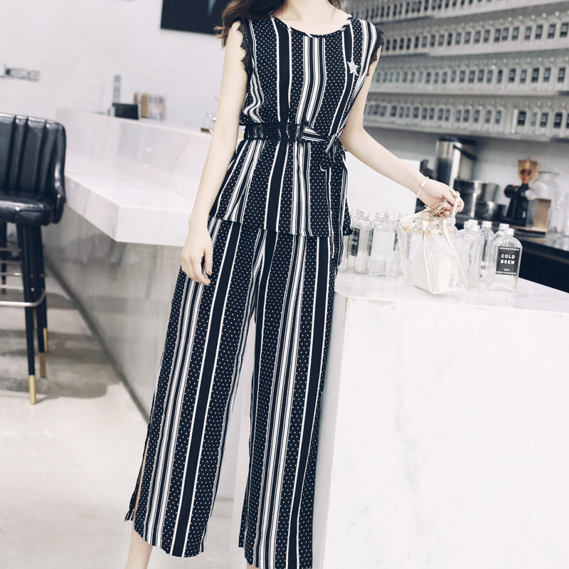 / 2018新款開叉闊腿褲套裝女夏季印花收腰上衣休閑時尚氣質兩件套潮