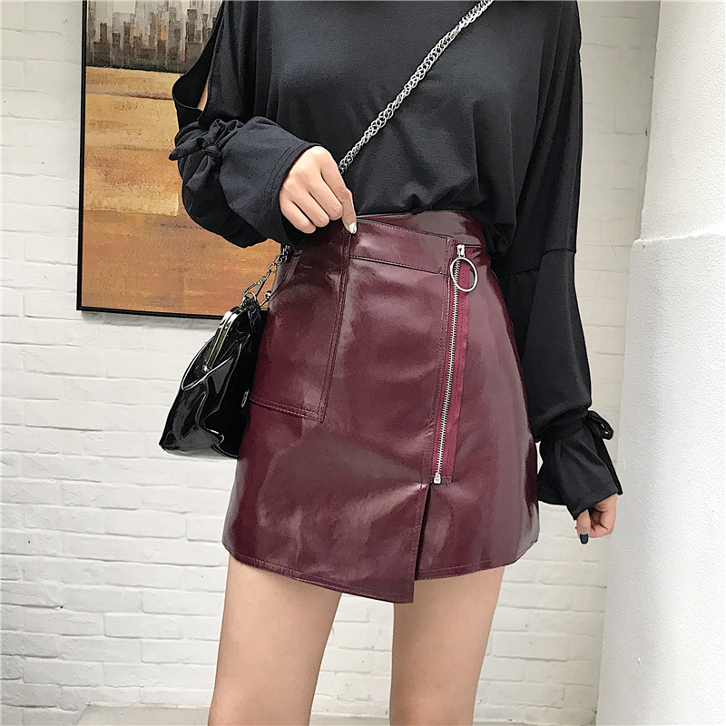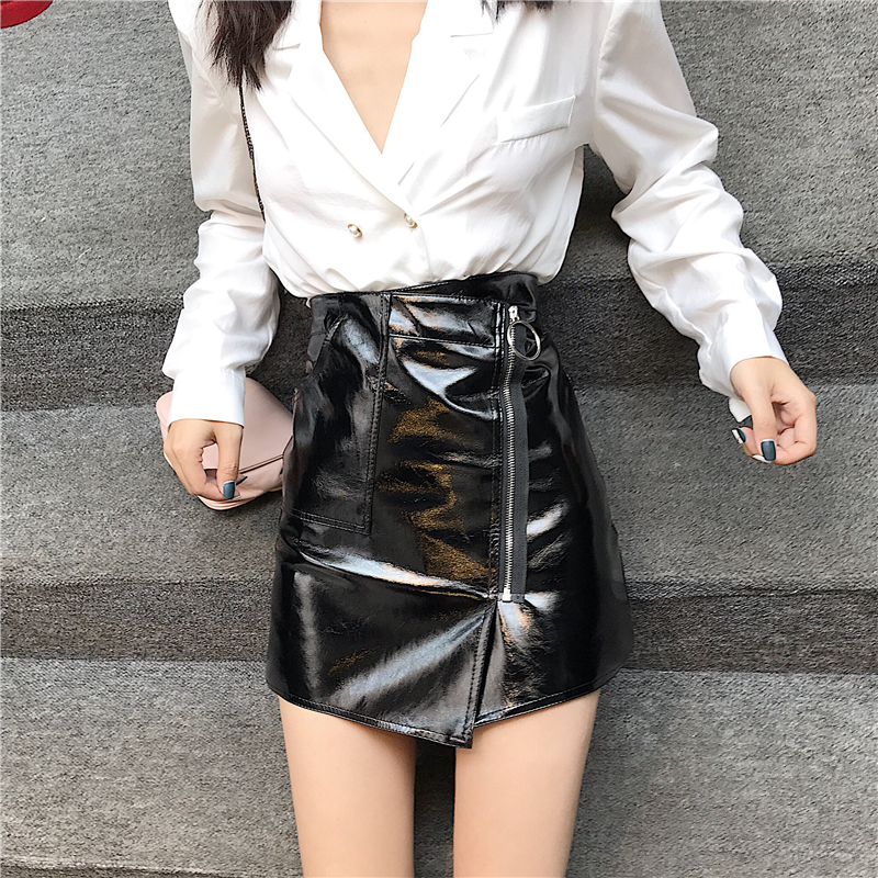 / 港味氣質百搭高腰半身裙女時尚chic不規則a字短皮裙拉鏈亮面裙子