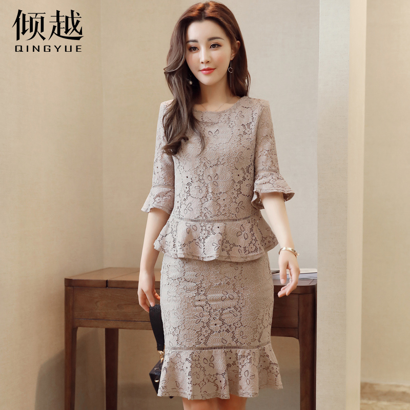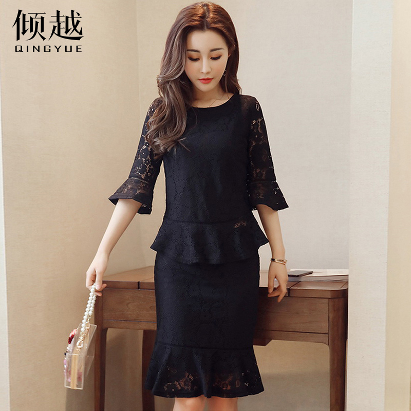 / 傾越2017春夏裝新款女套裝裙蕾絲長袖包臀魚尾裙修身兩件套連衣裙