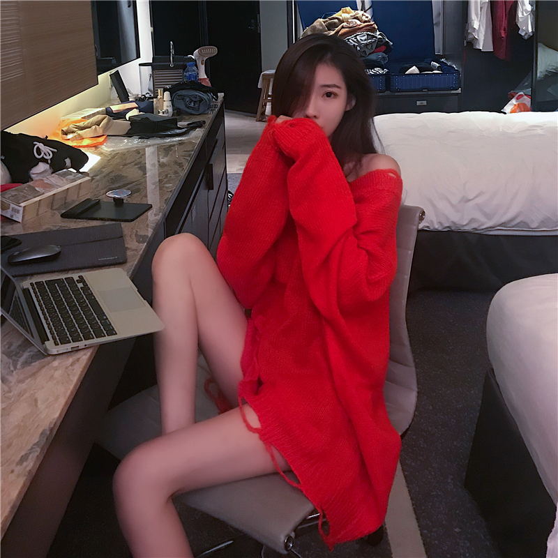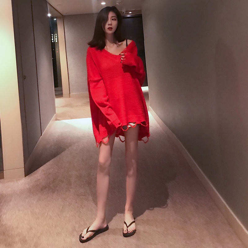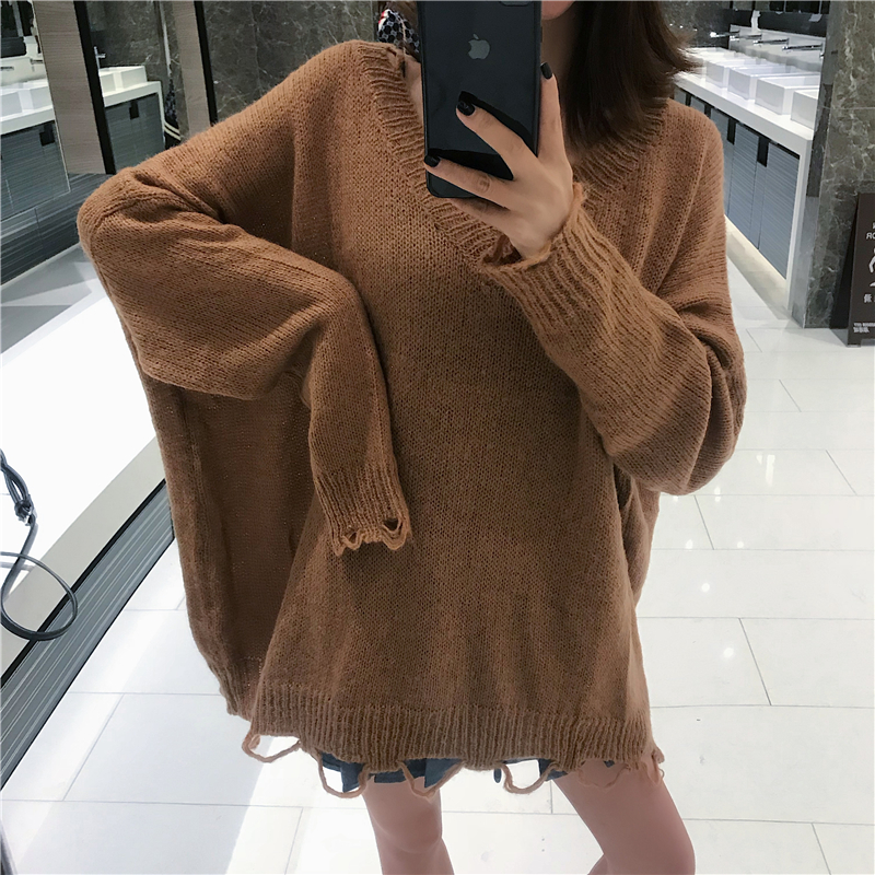 / 慵懶風新款韓版氣質上衣中長款chic秋季顯瘦時尚V領寬松套頭毛衣