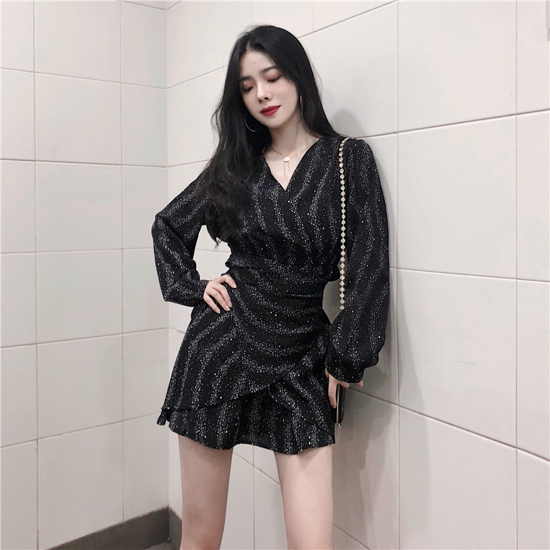 秋季新款時尚V領不規則荷葉邊chic綁帶星空連衣裙長袖雪紡打底裙