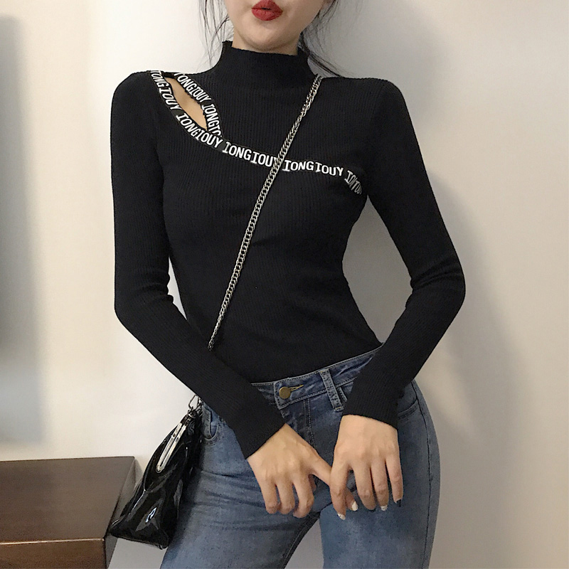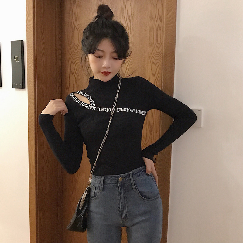chic上衣女秋季新款彈力2018時尚修身半高領漏肩長袖打底針織衫潮