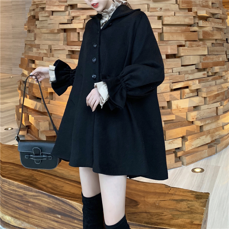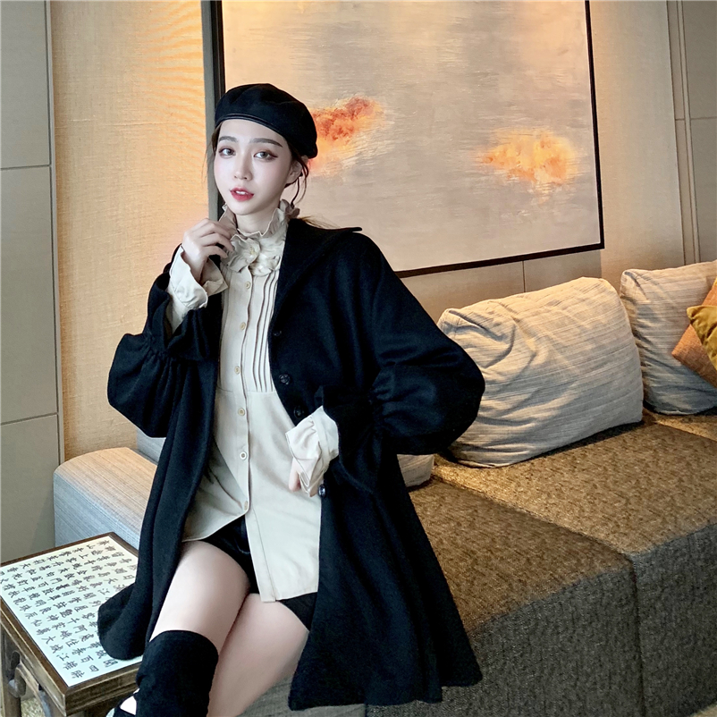 韓版黑色斗篷大衣加厚毛呢外套女秋冬2018新款+花邊領燈籠袖襯衣