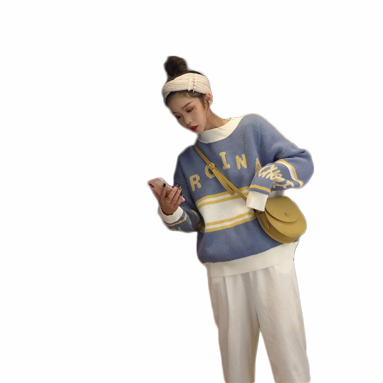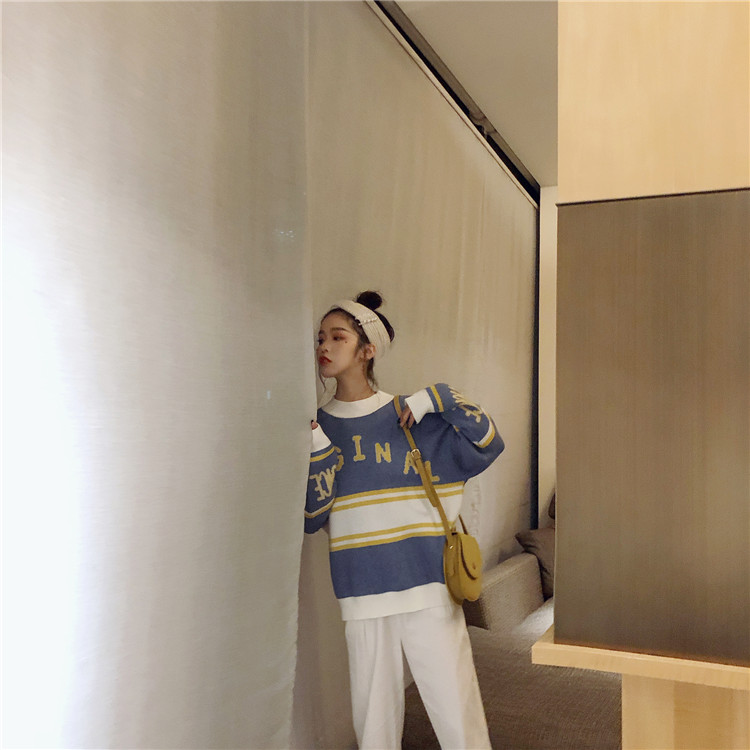 / 網紅同款慵懶風毛衣外套女韓版2018新款氣質拼色英文圓領針織衫潮