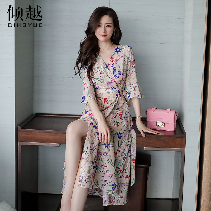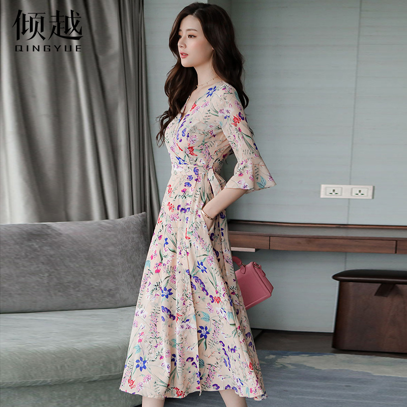 2017碎花長裙女夏季韓版V領印花雪紡連衣裙喇叭袖海邊度假沙灘裙