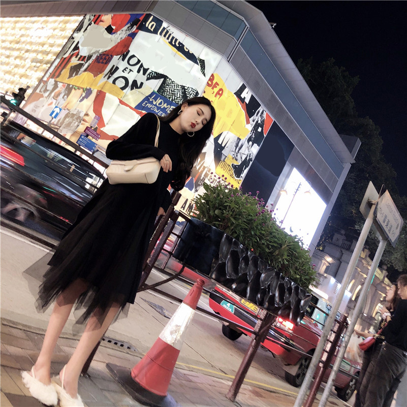 新款開叉套頭長款長袖毛衣外套網紗不規則半身仙女紗裙時尚套裝潮