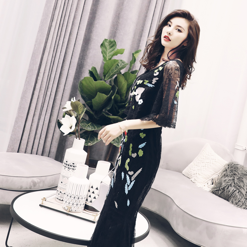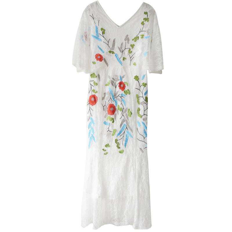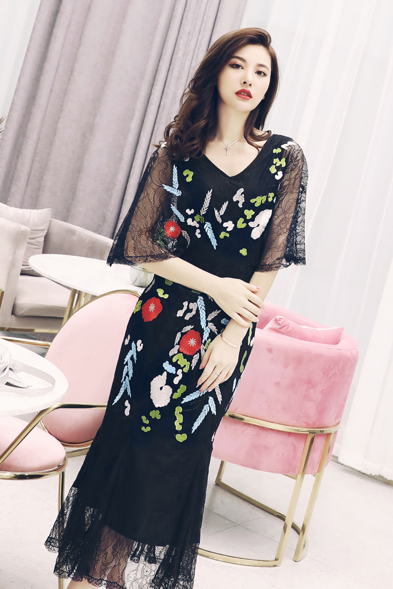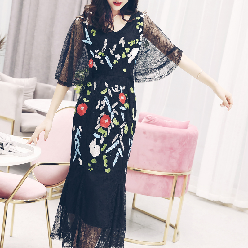 S秀2018夏季新款名媛氣質修身蕾絲長裙短袖顯瘦中長款刺繡連衣裙