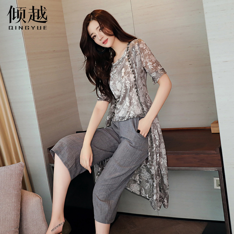 傾越2017碎花七分闊腿褲夏季新款時尚百搭修身氣質短袖背心三件套