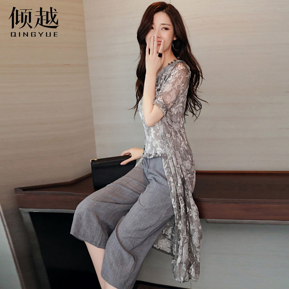 / 傾越2017碎花七分闊腿褲夏季新款時尚百搭修身氣質短袖背心三件套