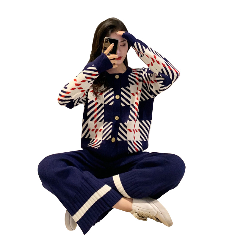 / 韓版新款時尚套裝chic復古撞色格紋毛衣外套寬松針織闊腿褲兩件套
