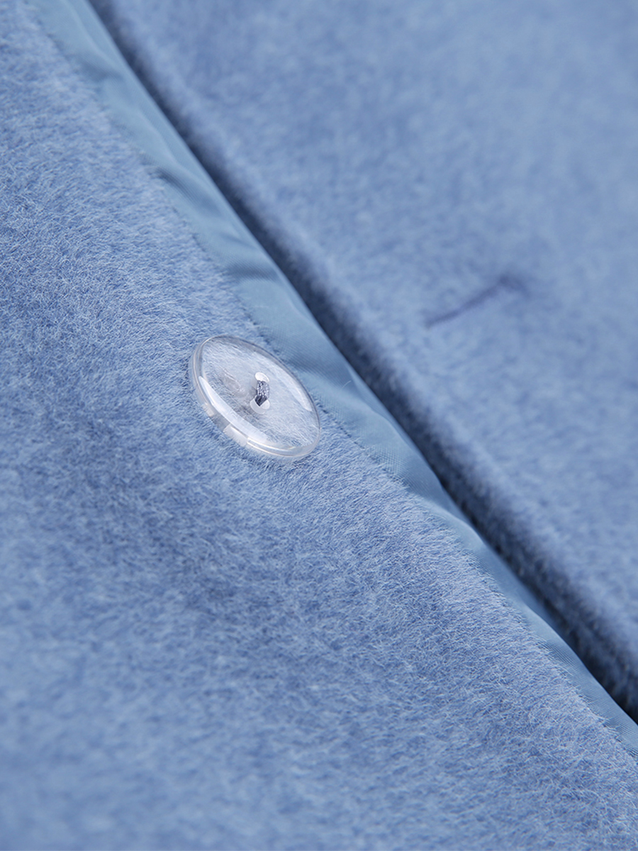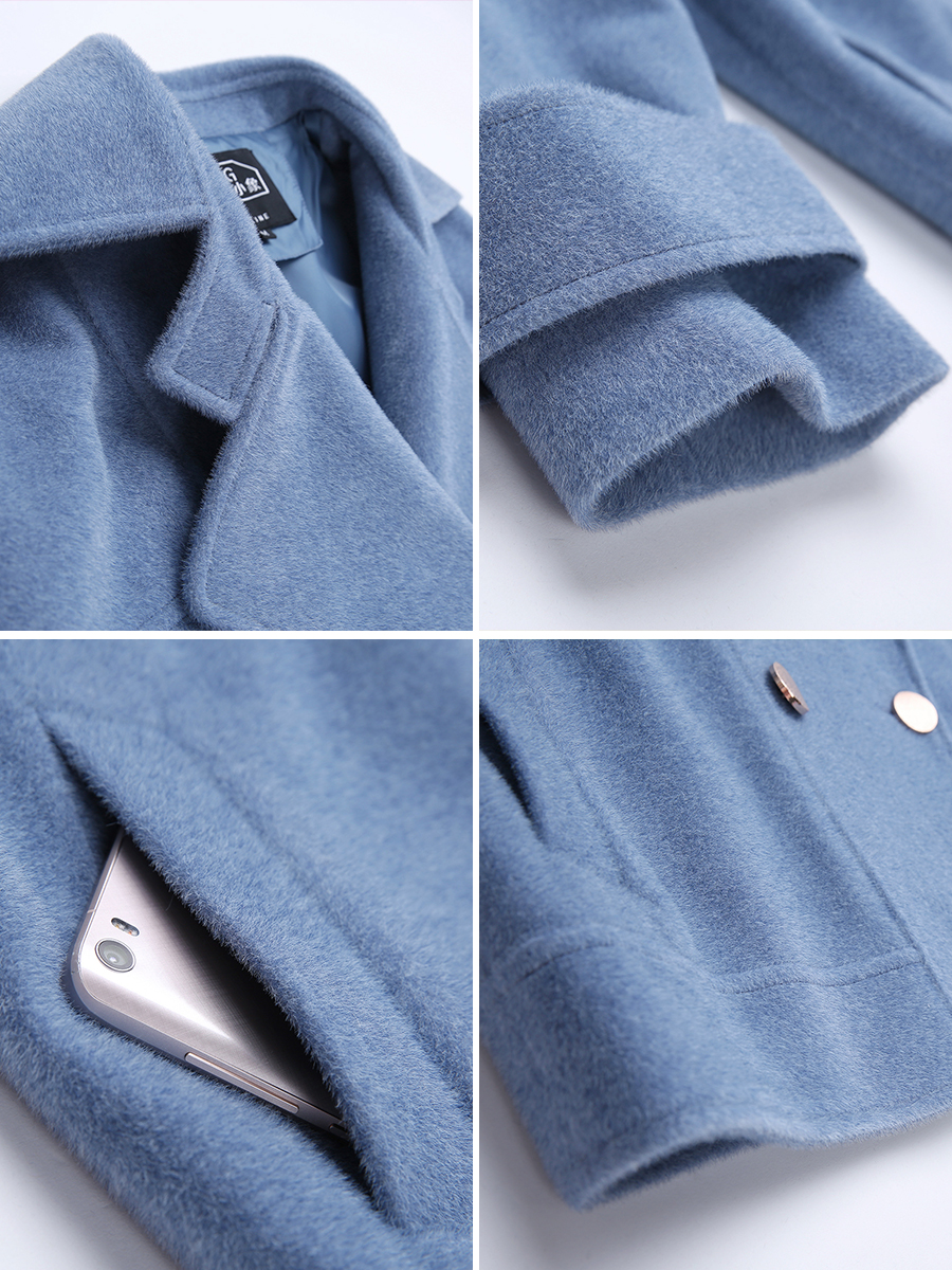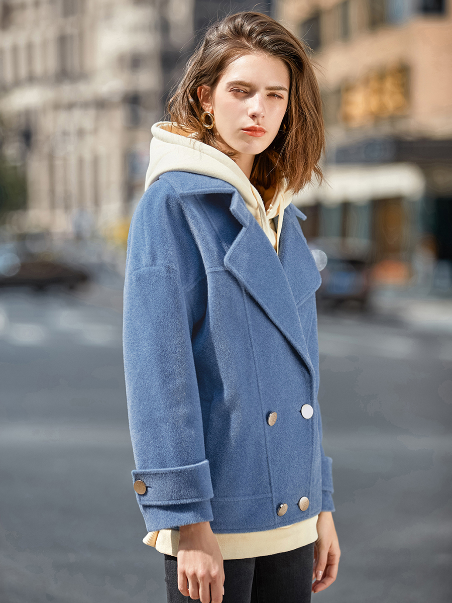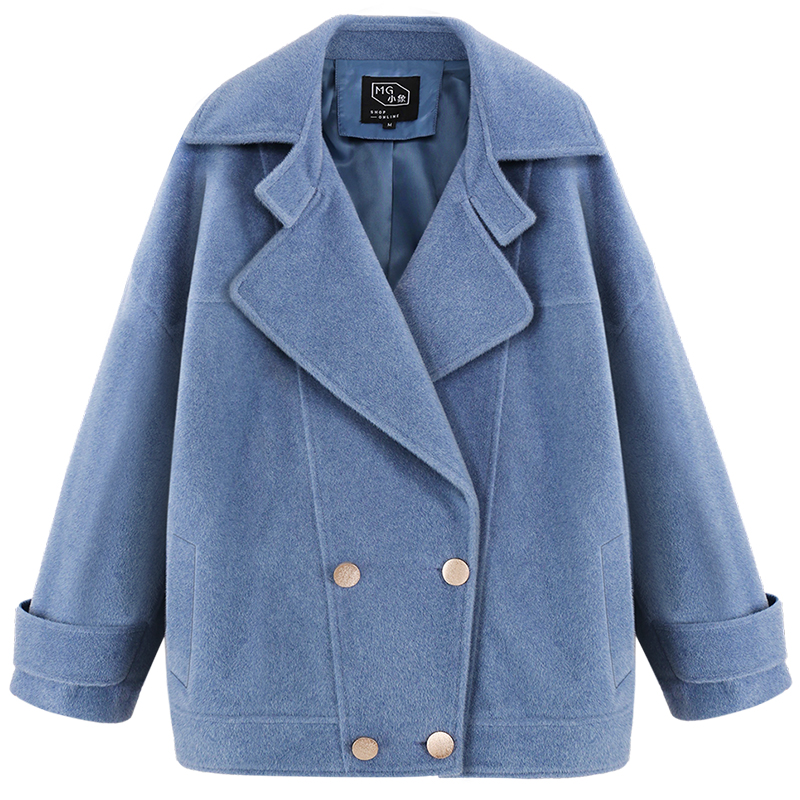 MG小象短款小個子毛呢外套女冬季2018新款寬松雙排扣藍色呢子大衣