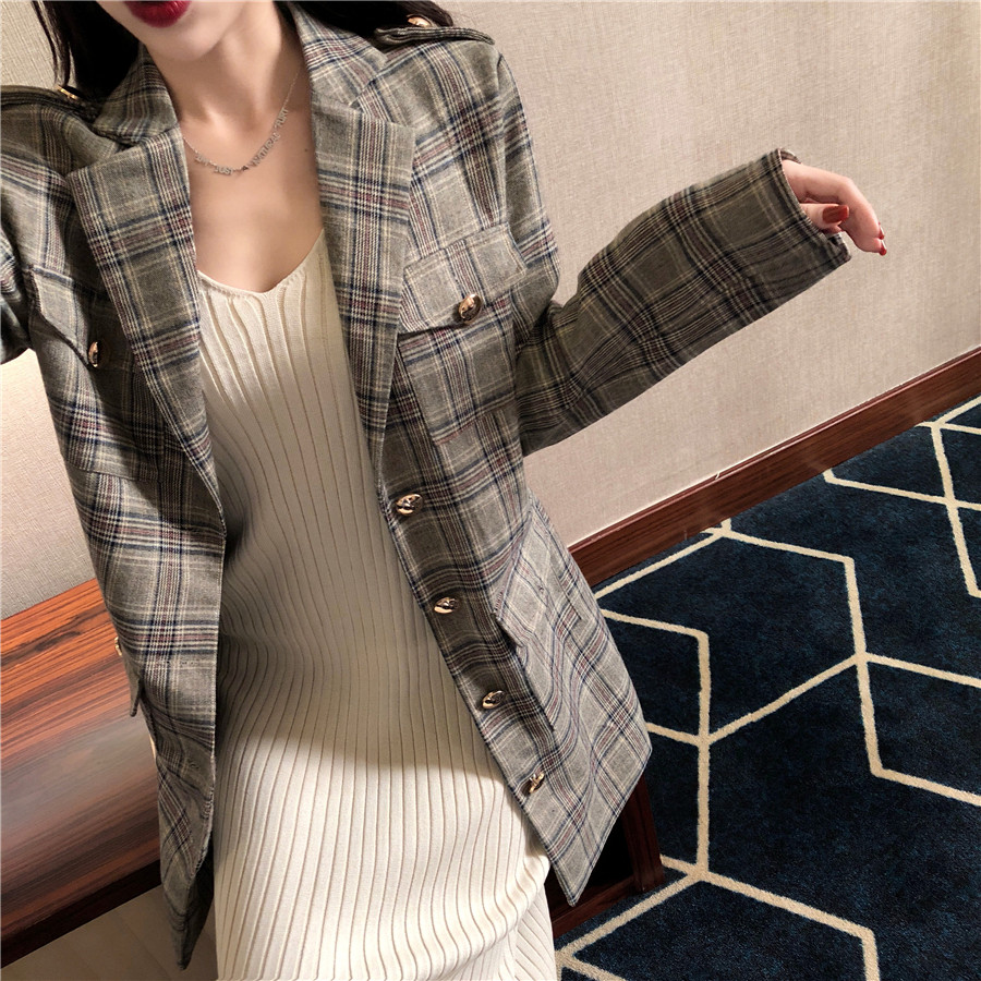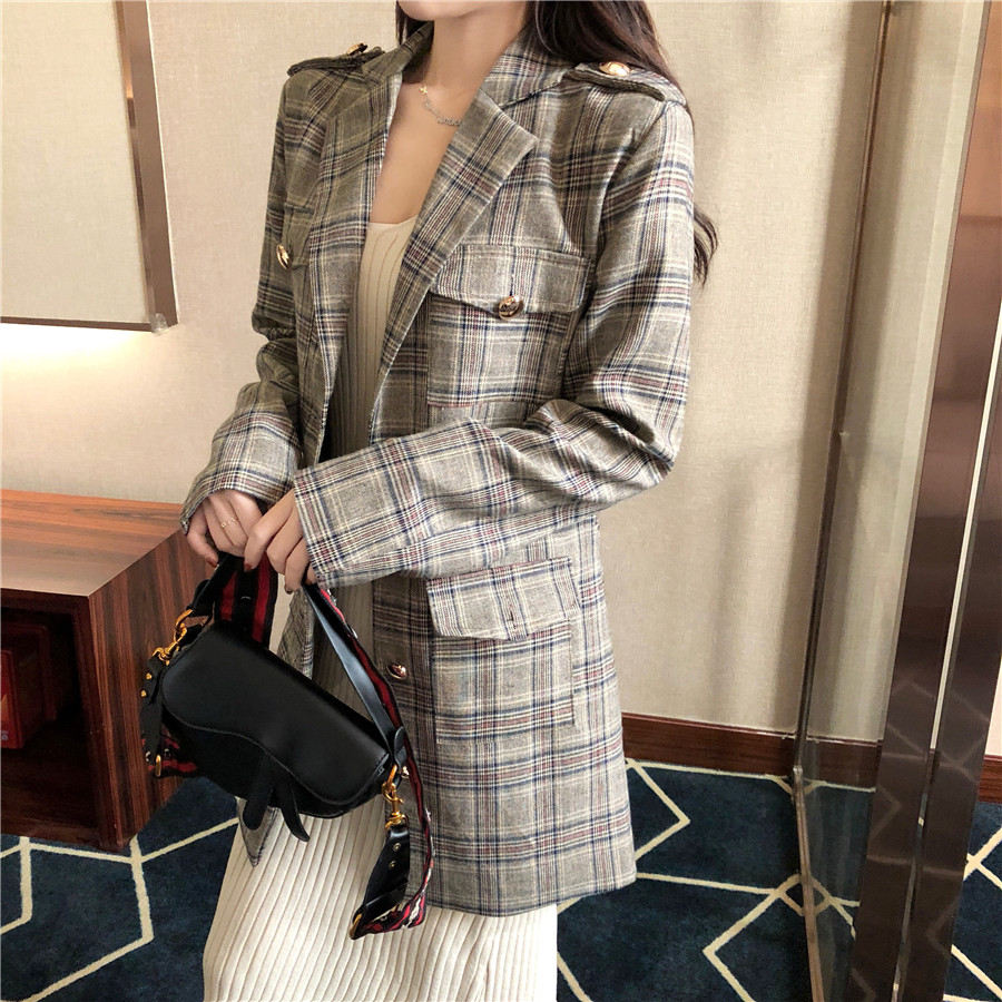 / 港味復古chic中長款系帶修身格子西裝外套秋季新款時尚百搭上衣潮