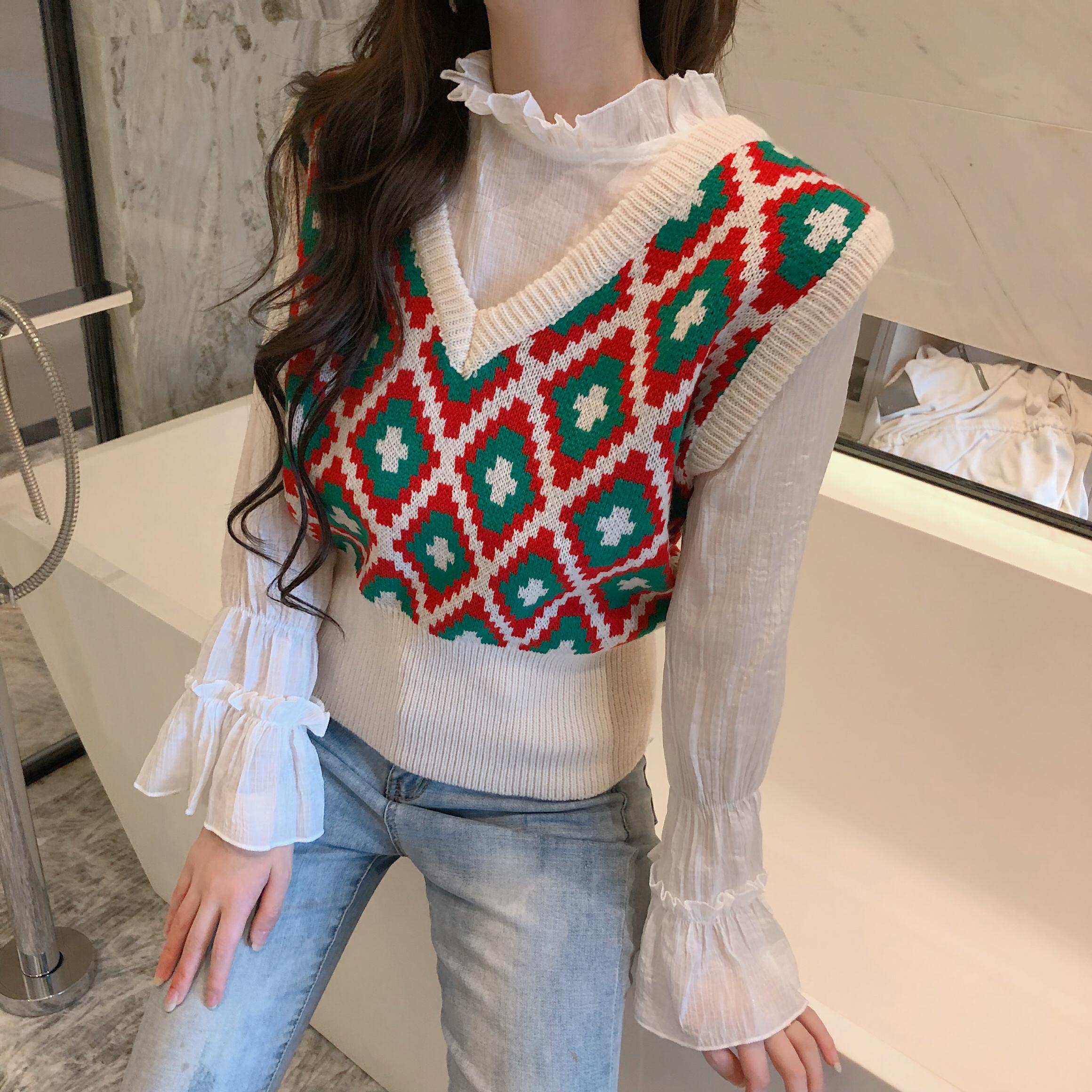 新款荷葉邊喇叭袖柔軟舒適打底衫菱形格毛衣馬甲時尚套裝兩件套女