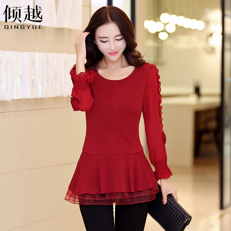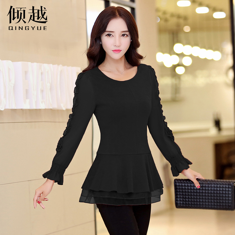 2017春秋新款女裝上衣長袖雪紡衫中長款打底衫韓版修身荷葉邊小衫