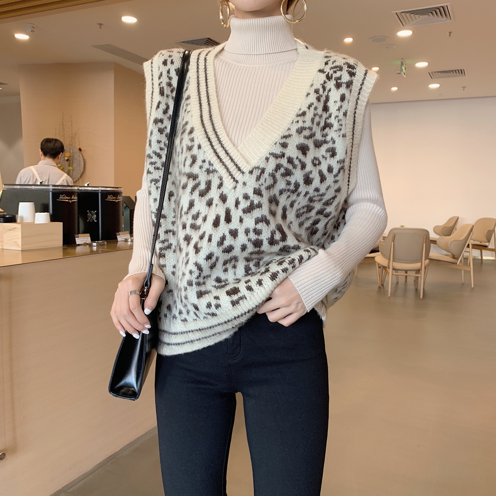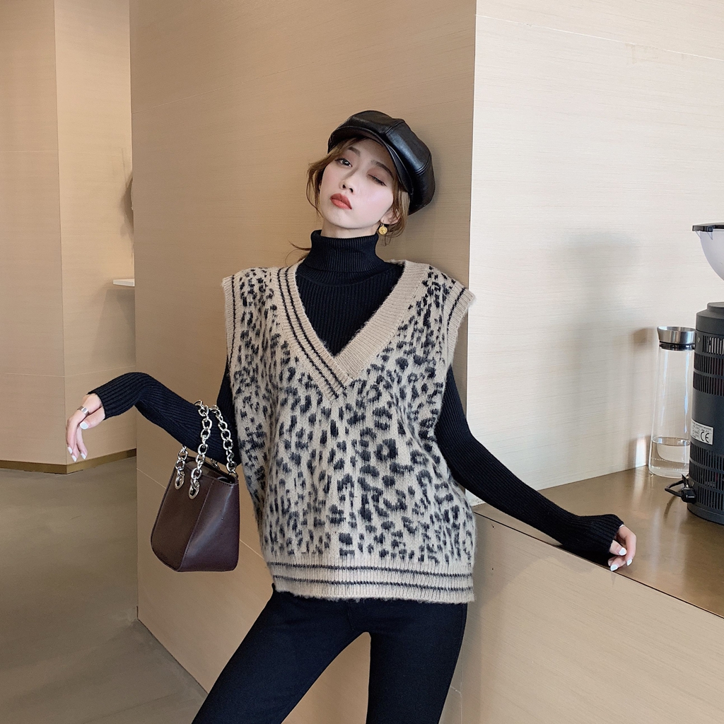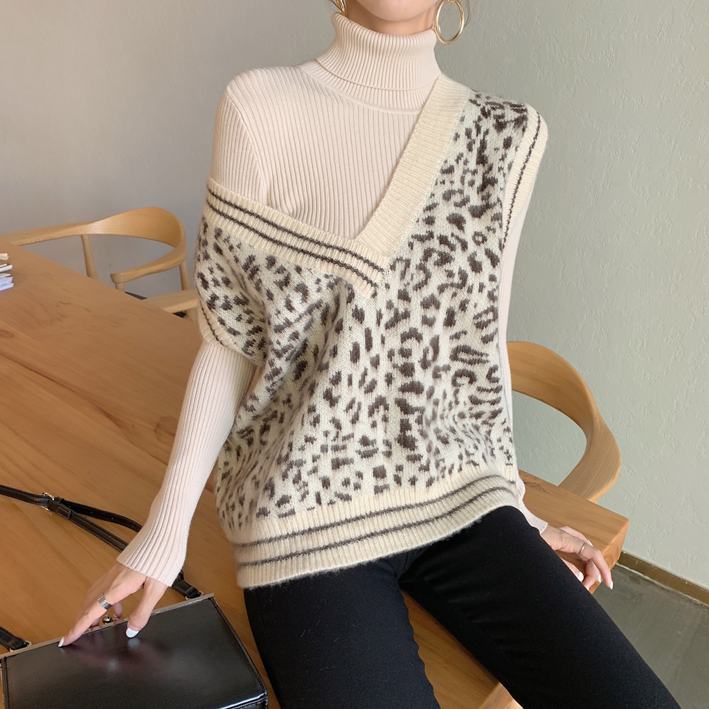 / 新款韓版百搭豹紋針織馬甲背心高領打底衫顯瘦顯高彈力褲時尚套裝