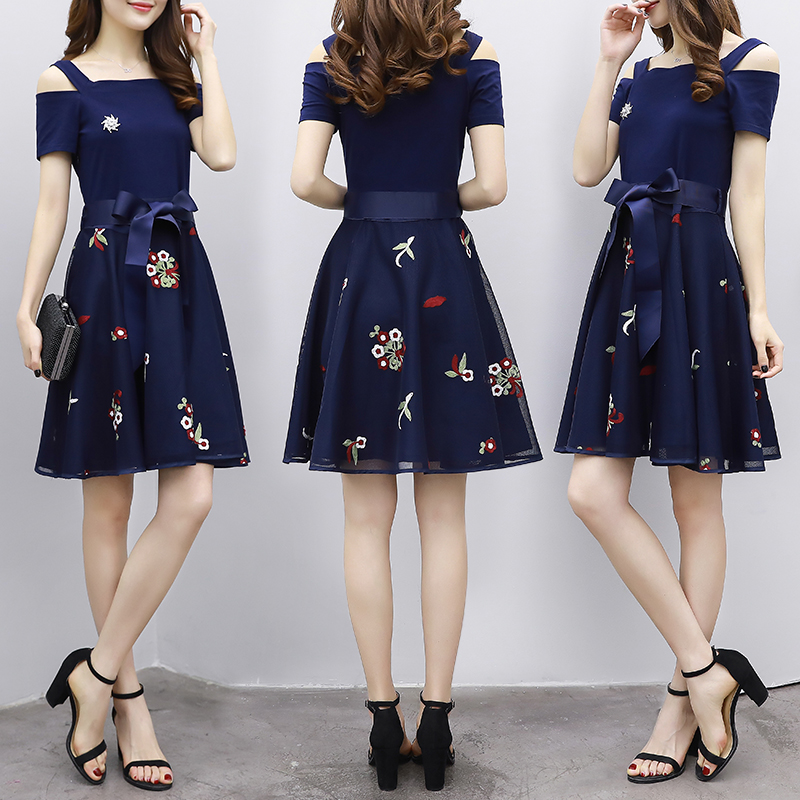 / 短袖露肩網紗針織連衣裙2017夏季女士韓版一字領繡花中長裙A字裙