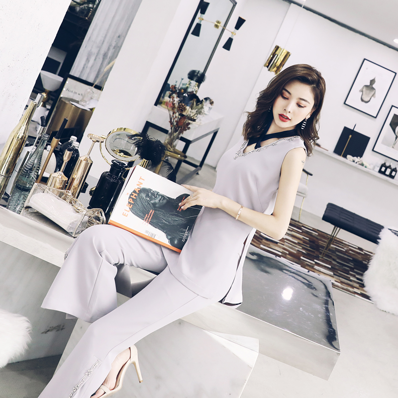 / 2018夏季新款時髦洋氣名媛氣質職業釘珠上衣開叉闊腿褲套裝兩件套