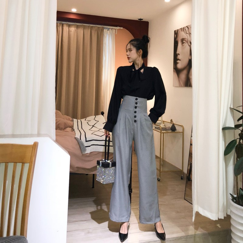 2018秋裝新款韓版套裝百搭氣質雪紡長袖上衣高腰排扣闊腿褲兩件套