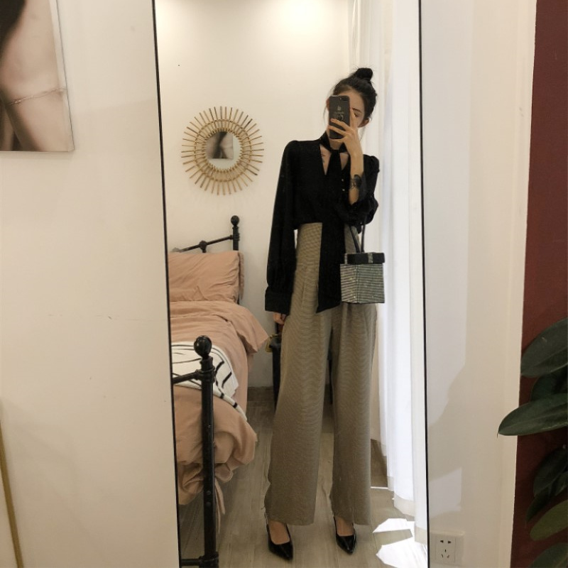 / 2018秋裝新款韓版套裝百搭氣質雪紡長袖上衣高腰排扣闊腿褲兩件套