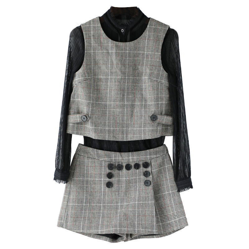 / 名媛氣質2018秋季新款格子套裝網紗打底衫上衣半身裙款短裙三件套