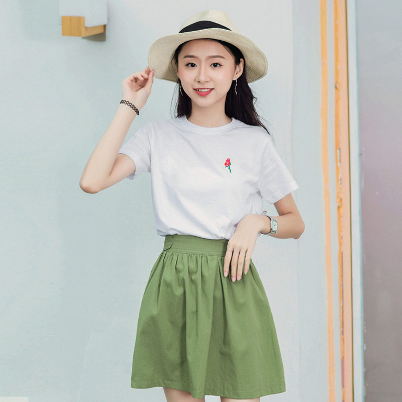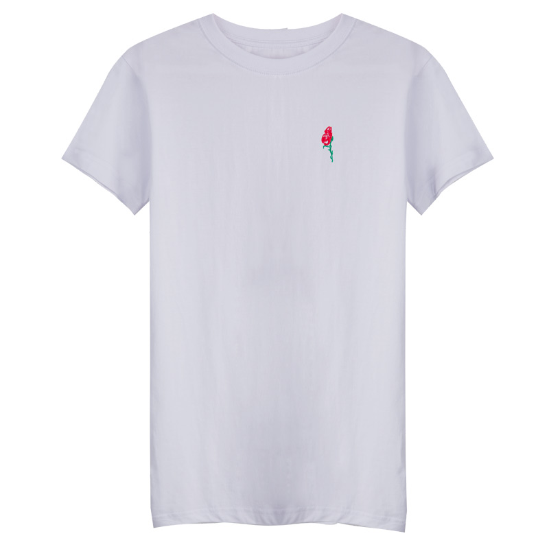 夏裝新款上衣短袖t恤女純白色修身玫瑰花刺繡打底衫半袖百搭