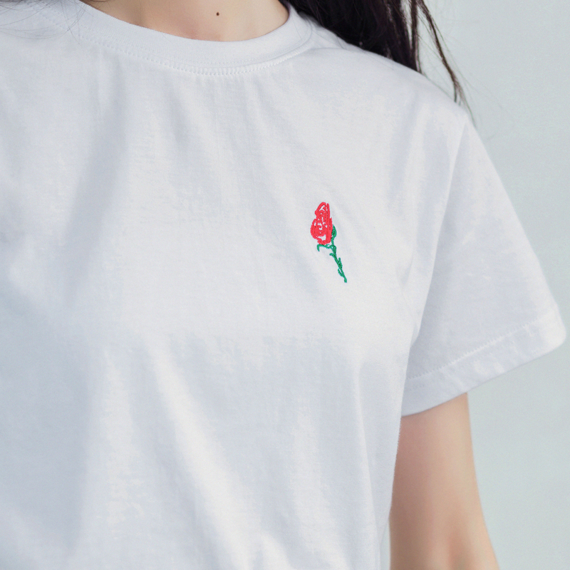 / 夏裝新款上衣短袖t恤女純白色修身玫瑰花刺繡打底衫半袖百搭