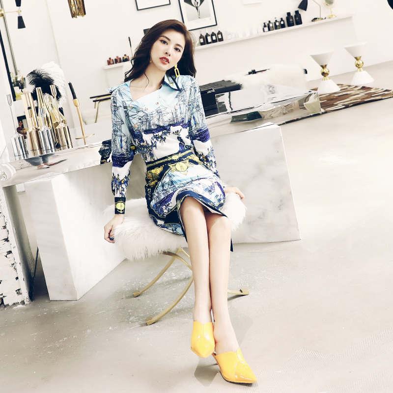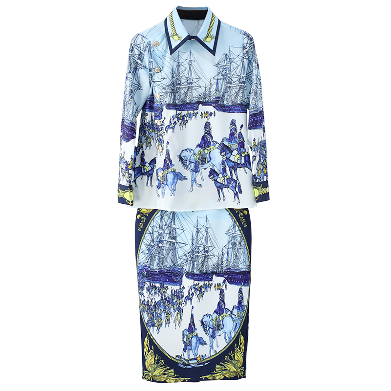 名媛氣質2018秋季新款歐美女裝印花襯衫上衣高腰半身裙兩件套裝潮