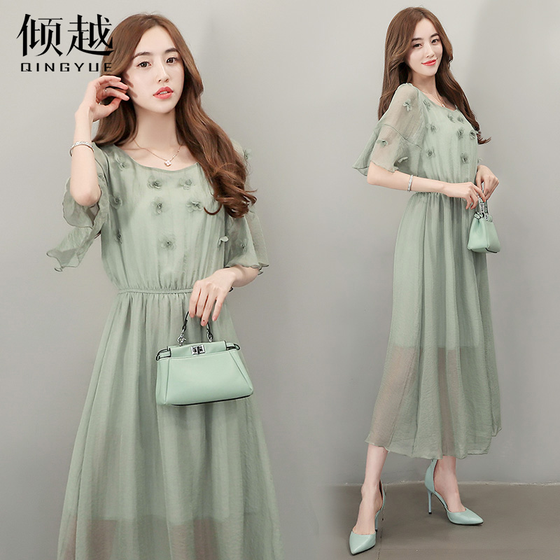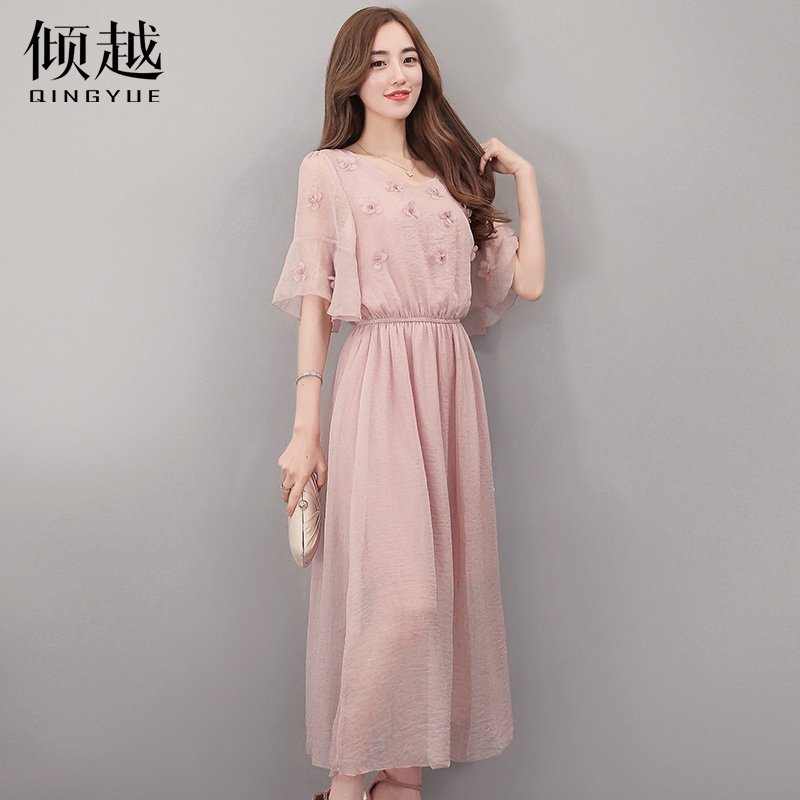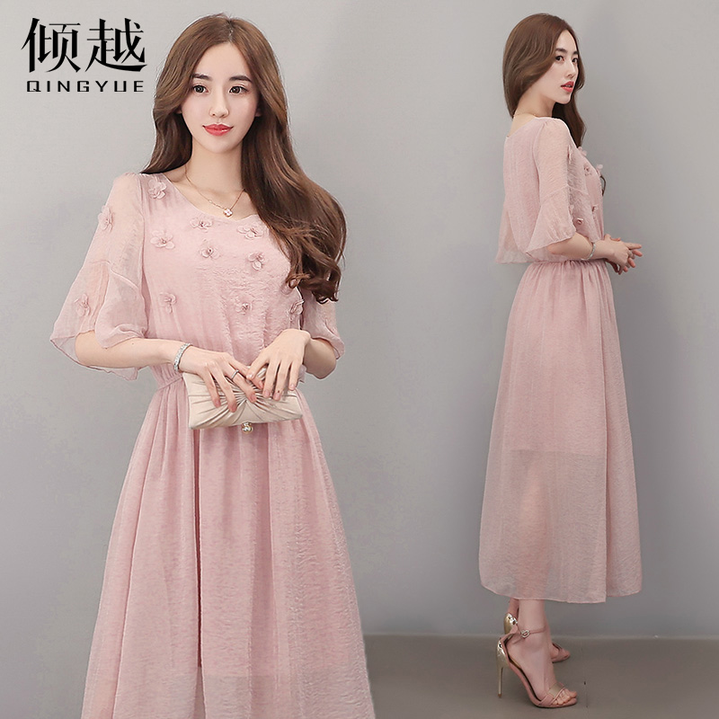 2017夏季新款韓版雪紡連衣裙女中長款短袖沙灘裙修身顯瘦裙子長裙
