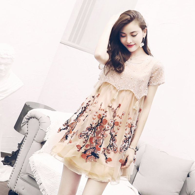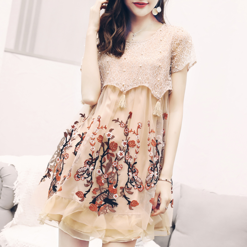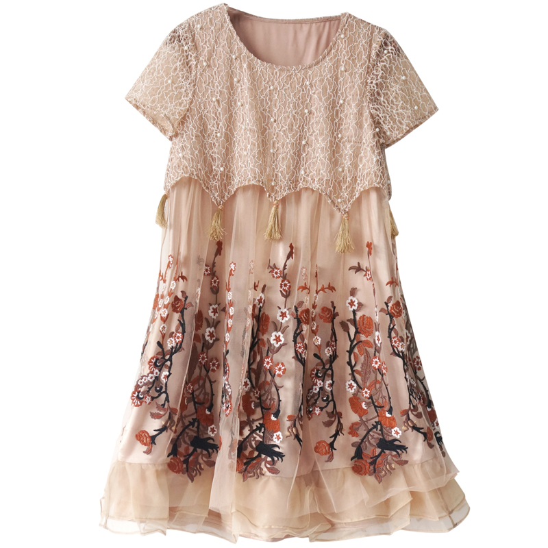 / 夏季氣質名媛大碼顯瘦流蘇鏤空蕾絲拼接繡花刺繡網紗歐根紗連衣裙