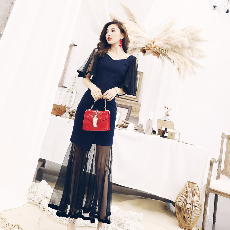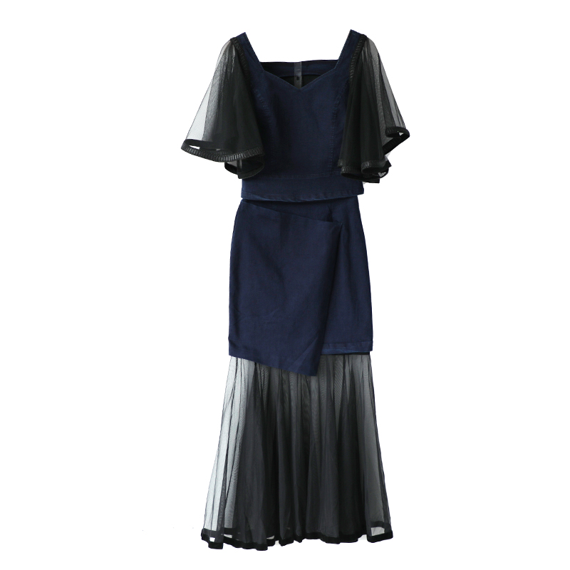 / 歐洲站夏裝港味小心機網紗拼接上衣牛仔短裙魚尾半身裙兩件套裝女