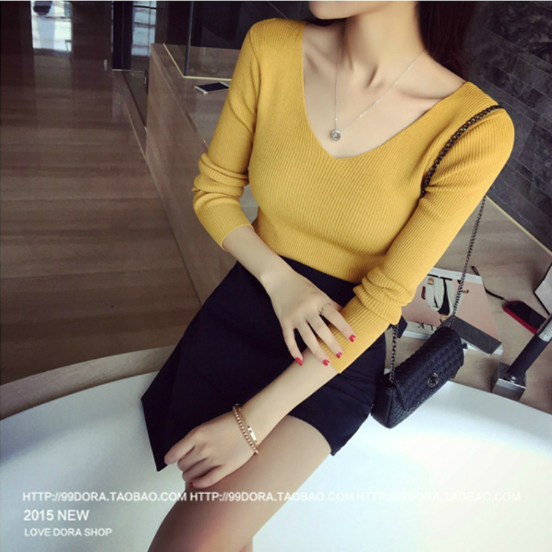 / 套頭毛衣打底衫秋款女裝韓版V領修身短款白色長袖針織衫女上衣潮