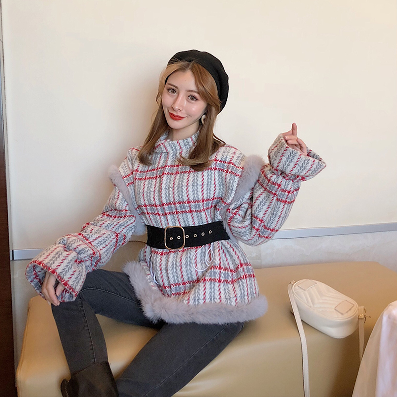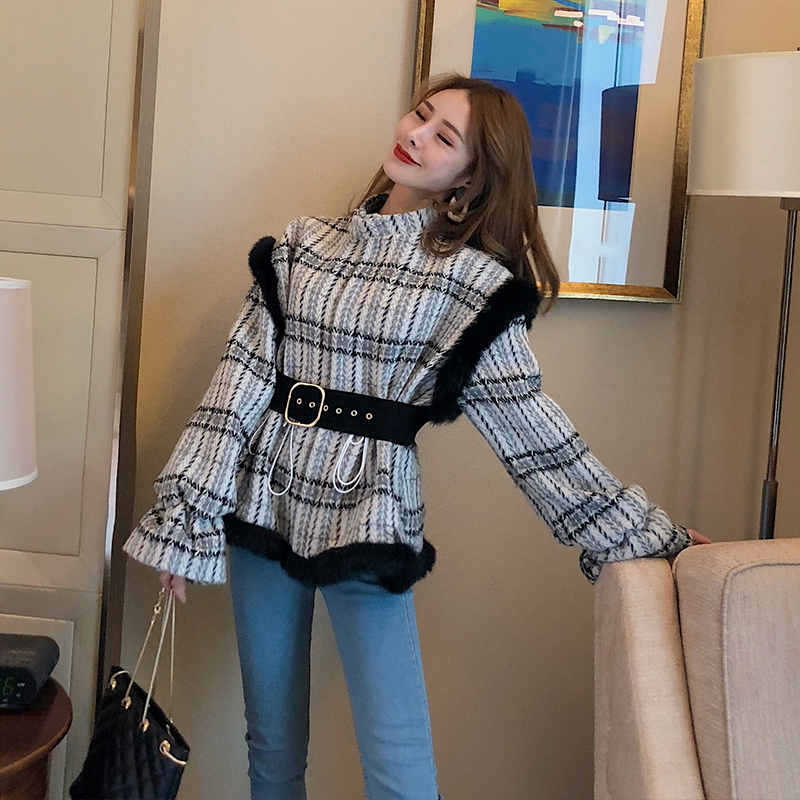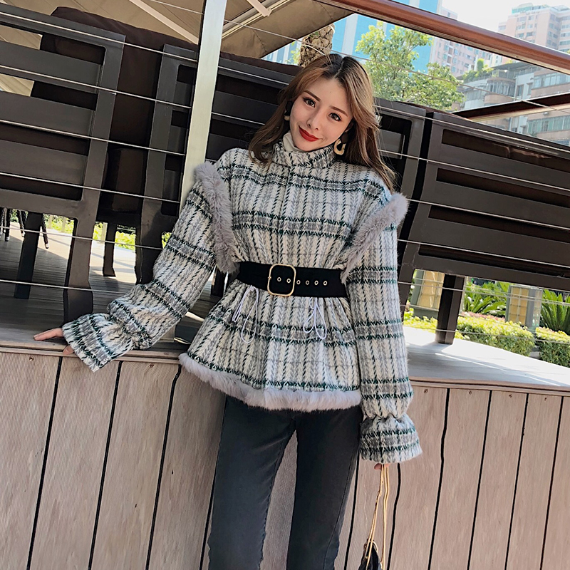 / 秋冬新款韓版喇叭袖寬松格紋chic時尚氣質開衫保暖加厚呢子外套女