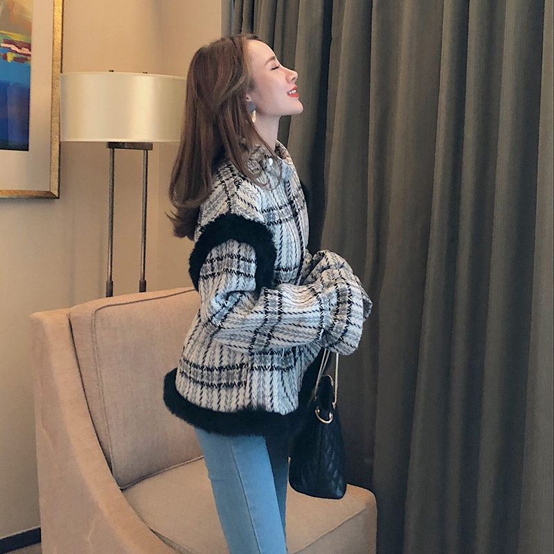 秋冬新款韓版喇叭袖寬松格紋chic時尚氣質開衫保暖加厚呢子外套女